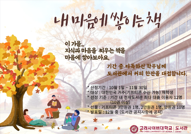 안녕하세요? 고려사이버대학교 도서관입니다. 도서관에서 "내 마음에 쌓이는 책" 이벤트를 진행합니다. 이벤트 기간 중 다수 대출 이용자 중 재학생 12인을 선정하여 소정의 선물을 드립니다. 학우 여러분의 많은 관심 부탁드립니다. ■ 산정 기간 : 2024. 10. 1(화) ~ 11. 30(목) ■ 선정 기준 : 기간 내 전자도서관 최다 대출 이용자 12명 ■ 대상자 : 고려사이버대학교 재학생 ■ 발표일 : 12월 중 (내부 사정에 의해 일정이 조정될 수 있습니다.) ■ 선물 : 기프티콘 12명(문자 발송) ![]() |
